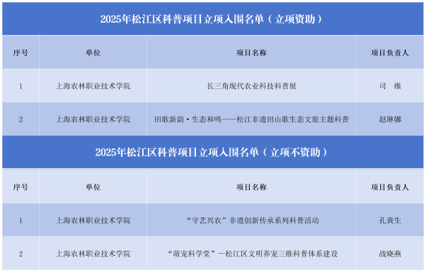 近日,根据上海市松江区科学技术委员会《关于2025年松江区科普项目立项入围名单的公示》文件,我院《长三角现代农业科技科普展》、《田歌新韵·生态和鸣——松江非遗田山歌生态文旅主题科普》、《“守艺兴农”非遗创新传承系列科普活动》和《“萌宠科学堂”—松江区文明养宠三维科普体系建设》入围2025年松江区科普项目立项名单。