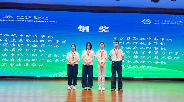 8月20日至23日,2025年世界职业院校技能大赛总决赛争夺赛林业赛道(中职组)在甘肃林业职业技术大学举办。来自全国54所中职院校的215名选手齐聚赛场、激烈角逐。由植物科学技术系园林技术专业(五年一贯)231班蔡汪亦、232班李诗涵、季成杰以及241班刘妙同学组成的参赛团队表现优异,最终荣获铜奖。