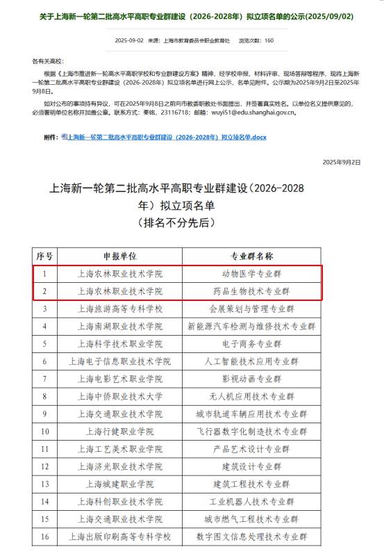 根据上海市教育委员会《关于开展上海新一轮第二批高水平高职专业群建设(2026-2028年)的通知》,学院高度重视,积极组织申报,经专家评审、校内公示、学校申报、市教委组织专家对材料进行评审等环节,动物医学专业群、药品生物技术专业群入选上海新一轮第二批高水平高职专业群建设立项。目前,学院已有园艺技术专业群、动物医学专业群、药品生物技术专业群等入选上海新一轮高水平高职专业群建设项目。