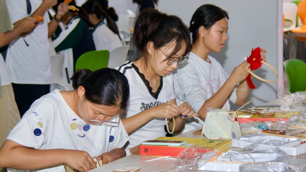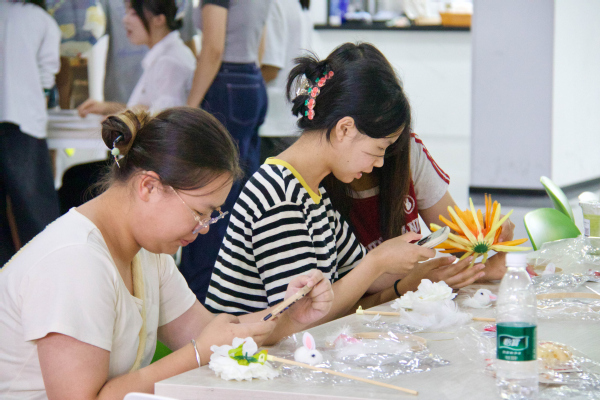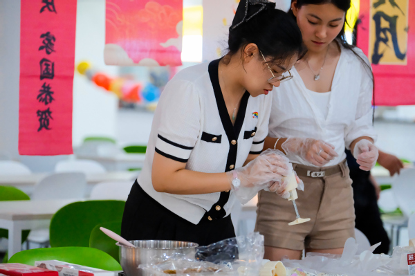 “手工月饼制作区”里,食堂阿姨现场演示揉面、包馅、压模的步骤,学生们分组协作,一双双巧手将面团与馅料巧妙结合,按压出印有“中秋”“团圆”字样的月饼模具。不一会儿,一个个造型精致的月饼便整齐摆放。“第一次亲手做月饼,感觉特别有意义,打算把成品带回家给家人尝尝”,参与制作的园林(贯)251班的秦书瑶同学说。