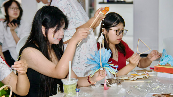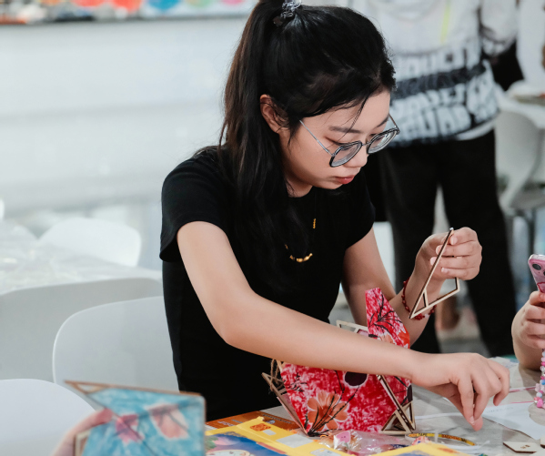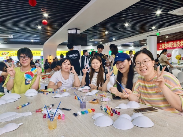 “灯笼制作区”与“绘画葫芦区”则成为学生们展现创意的舞台。大家手持灯笼DIY材料包,认真搭建骨架、粘贴彩纸、装饰流苏,不一会儿,一盏盏色彩鲜艳、样式各异的中秋灯笼便悬挂起来,为食堂增添了浓浓的节日氛围;空白葫芦旁,学生们蘸取丙烯颜料,精心绘制月亮、国旗、祥云等图案,将中秋的浪漫与国庆的庄重融于笔端,每一件作品都承载着对祖国的美好祝福。