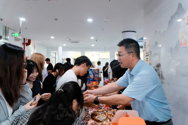 第一食堂内张灯结彩、暖意融融。现场设置多个特色互动区域,每个区域都人气满满。在“月饼发放区”,学生骨干早已将独立包装的月饼分装完毕,同学们有序排队领取。接过月饼的瞬间,大家的脸上洋溢着笑容,“虽然不能回家过节,但学院的月饼让我感受到了家的温暖”,同学们纷纷说道。