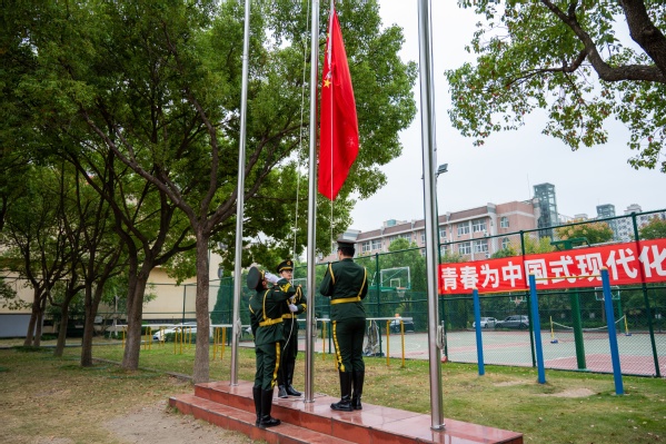在雄壮激昂的国歌声中,鲜艳的五星红旗冉冉升起,迎风飘扬。全体师生肃立注目,以坚定的目光和庄重的姿态,向伟大祖国致以崇高敬意和深切热爱。