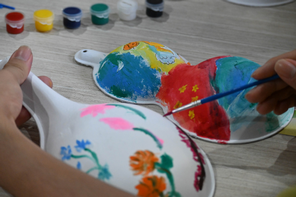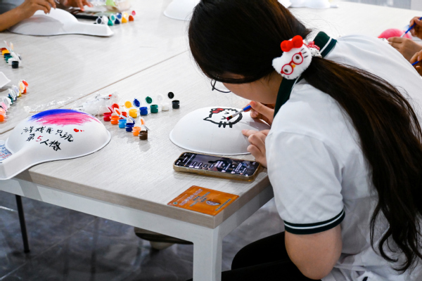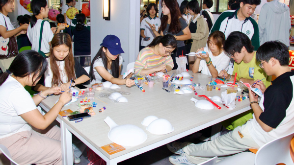 “灯笼制作区”与“绘画葫芦区”则成为学生们展现创意的舞台。大家手持灯笼DIY材料包,认真搭建骨架、粘贴彩纸、装饰流苏,不一会儿,一盏盏色彩鲜艳、样式各异的中秋灯笼便悬挂起来,为食堂增添了浓浓的节日氛围;空白葫芦旁,学生们蘸取丙烯颜料,精心绘制月亮、国旗、祥云等图案,将中秋的浪漫与国庆的庄重融于笔端,每一件作品都承载着对祖国的美好祝福。
