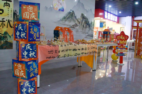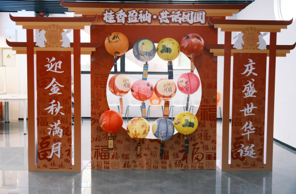 第一食堂内张灯结彩、暖意融融。现场设置多个特色互动区域,每个区域都人气满满。在“月饼发放区”,学生骨干早已将独立包装的月饼分装完毕,同学们有序排队领取。接过月饼的瞬间,大家的脸上洋溢着笑容,“虽然不能回家过节,但学院的月饼让我感受到了家的温暖”,同学们纷纷说道。