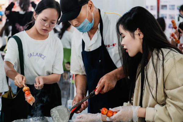 “冰糖葫芦制作区”内,食堂大叔辅助学生串水果、裹糖衣,学生们跃跃欲试,亲手制作的冰糖葫芦酸甜可口,成为现场最受欢迎的“甜蜜味道”。