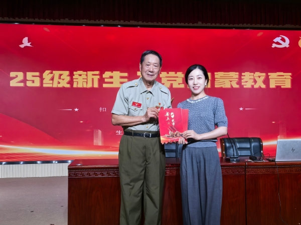 王一杰同志以“一生心向党,建功新时代”为主题,用亲身经历搭建起红色教育的桥梁。他结合战火纷飞年代的战斗记忆,深情讲述了自己在艰苦环境中坚守信仰、奋勇拼搏的经历,从硝烟弥漫的战场到和平时期的岗位坚守,每一段故事都饱含着对党的忠诚与热爱。朴实的语言、真挚的情感引发新生强烈共鸣,现场不时响起阵阵掌声,成为对老党员崇高精神的由衷致敬。王一杰同志还代表松江区老兵讲故事宣讲团,向生药系赠送《老兵讲故事》一书,希望以红色书籍为载体,让新生在文字中感受老兵精神、传承红色基因。随后,杜孟静以“我心向党,不负韶华”为题,围绕“如何端正入党动机”,结合新生学习生活实际,从“入党的初心是什么”“如何以行动向党组织靠拢”等方面展开讲解,引导新生将个人理想与党的事业、国家发展紧密结合,明确在新时代背景下青年学子的责任与担当。