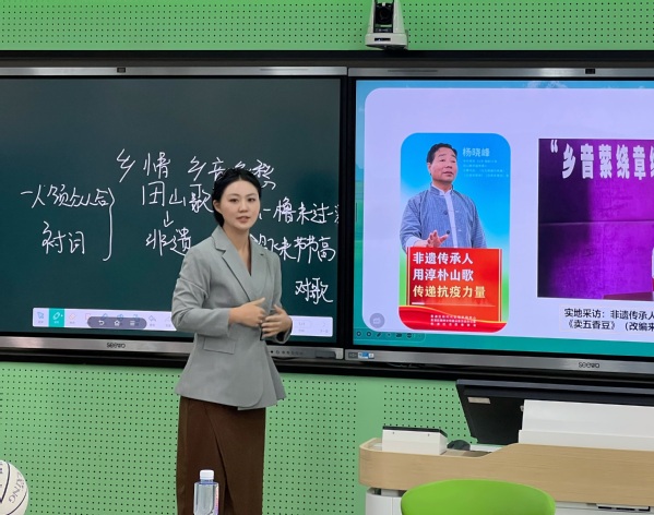 赵琳娜老师以《公共艺术》课程说课拉开序幕。在课堂教学展示环节,引领学生寻访上海乡村非遗农乐“田山歌”,将地方非遗文化巧妙融入美育课堂,使传统艺术在新时代的课堂上焕发出勃勃生机,体现了文化传承与公共艺术教育的深度融合。