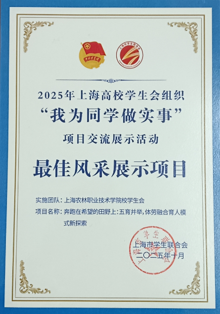 为进一步推动学联学生会聚焦主责主业、服务同学成长发展,2025年上海高校学生会组织“我为同学做实事”项目交流展示活动于10月19日举行,来自全市70所高校的近200名师生参加活动。经校级选拔和推荐、市级初评、市级决赛展示,我院学生会项目《奔跑在希望的田野上:五育并举,劳体融合育人模式新探索》从全市众多优秀项目中脱颖而出,获评最佳风采展示项目。