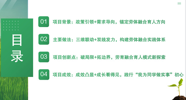 该项目紧扣《教育强国建设规划纲要(2024—2035年)》《关于全面加强新时代大中小学劳动教育的意见》《关于全面加强和改进新时代学校体育工作的意见》政策部署和核心目标,学生会以学生需求为导向,三维联动+双线发力,构建劳体融合实践体系,将体育赛事、校园活动等与农耕劳动和文化传承深度融合。