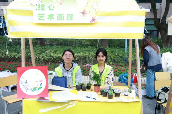 “绘心艺术画廊”前,“绿植主理人”正在为同学们讲解画作中的心灵疗愈元素。“原来这幅画的色彩搭配有这么多心理学知识!”听着讲解,同学们一边欣赏绘画,一边在艺术的世界里完成心灵疗愈,现场充满了艺术与知识交融的浓厚氛围。