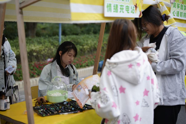 “慧职梦”生涯规划工作室的“蜜糖絮语·情绪补给站”前,志愿者用“你今天真的很棒”“小挫折都是成长的勋章”的温柔絮语,轻轻包裹每一颗需要慰藉的心,以甜蜜对话和彩色糖果为心灵注入温暖能量。