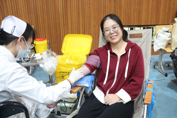 献血活动过程中,体育馆内秩序井然、暖意融融。场地清晰划分等候区、体检区、献血区、休息区四大功能区域,各区域标识明确、流程顺畅。上午8:30,无偿献血工作准时开始。今年献血首次采用无纸化信息登记,师生们提前扫码完成线上报名,现场在志愿者指引下完成信息核验,无需填写纸质表格,登记效率大幅提升。随后,依次完成健康问询、血压测量、血液化验等前期检查。体检合格后,大家挽起衣袖、从容落座,鲜红的血液顺着导管流入血袋,成为拯救生命的“希望火种”。