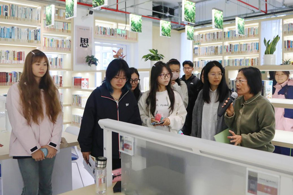 师生们分批次进入侬书斋参观。该智能化侬书斋可容纳藏书两万册,图书仅供阅览,不提供外借服务。书斋实现了多项智能管理功能:自动统计进出人数,覆盖高速无线网络,配备多角度超高清红外摄像头进行全方位监控;室内灯光、窗帘和空调均可智能调控。阅读座位支持小程序预约,预约成功后签到入座,系统自动开启个人用电,离座后自动断电。