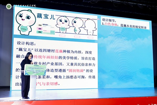 创意系主任路以兴展示了服务六安的成果,通过连四塘村纪实短片呈现了专家教授和青年学子深入田间地头的景象,从“花香莲塘”规划、徽派庭院建设,到红色文化挖掘、农业品牌升级与数字化营销,通过“设计赋美、文化育美、品牌铸美、传播致美、经营创美”的五美服务体系,推动了连四塘村的美丽蜕变。创意系视觉传达设计专业负责人付小川汇报了对连四塘村的整个服务历程与发展理念,云间创意产业学院副院长贾爱君发布了融合当地特色的连四塘村IP形象,创意系教师党支部书记郁琦首发了《石婆店镇全域旅游地图》。六安市裕安区石婆店镇镇长张乐成在现场推介当地特色农副产品,校内同步设置裕安特色农产品展区,助力农产品宣传推广。