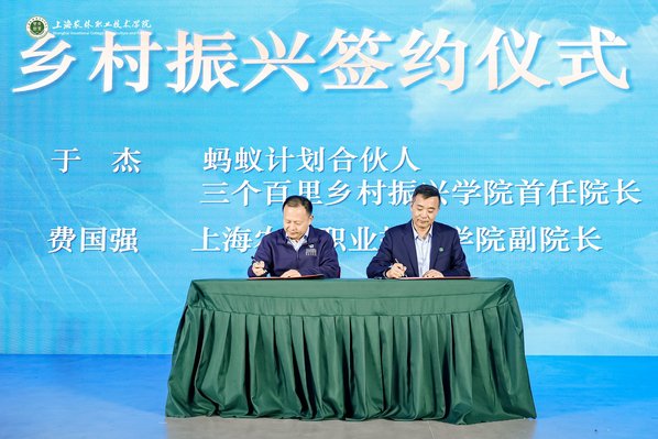 会议现场举行了乡村振兴签约仪式。上海农林职业技术学院副院长费国强与蚂蚁计划合伙人、三个百里乡村振兴学院首任院长于杰签署合作协议,双方将在乡村产业规划与人才培养等领域深化合作。乡村振兴新农人产教融合共同体迎来新成员,中国二十冶集团有限公司工程设计研究院副院长徐宁、上海极载实业有限公司总经理张海敏及上海农林职业技术学院副院长潘国俭共同为新增理事单位授牌,理事单位由原有的6家增至8家。