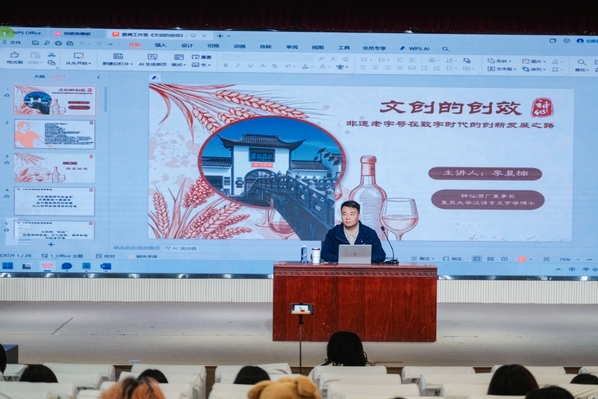 10月29日,在综合楼205报告厅内,创意系邀请校外企业导师、神仙酒厂董事长、复旦大学汉语言文字学博士李晨楠作《文创的创效——非遗老字号在数字时代的创新发展之路》专题讲座,共150余名师生参与,创意系党总支副书记张媛主持。
