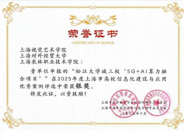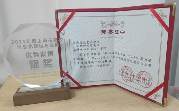 近日,由上海市高等教育学会信息管理专业委员会、校园网络专业委员会联合主办的2025年度上海市高校信息化建设与应用优秀案例评选结果正式公示。由上海视觉艺术学院、上海对外经贸大学与上海农林职业技术学院共同申报的“松江大学城三校‘5G+AI算力融合项目’”荣获优秀案例银奖。