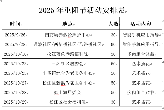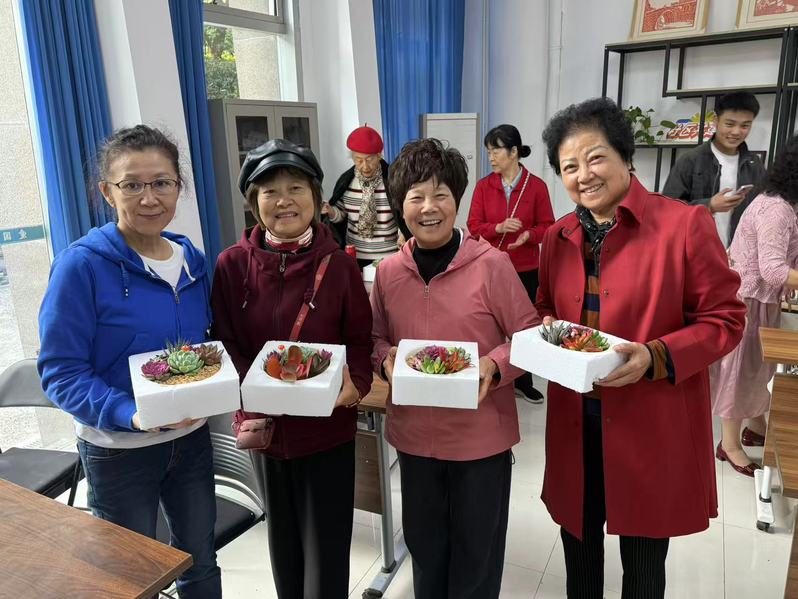 活动自9月下旬启动,持续至10月底,先后走进松江区社会福利院、国药康养泗泾照护中心、通波社区、蓝色港湾福利院、三湘社区居委会等多个社区及养老机构。课程内容贴近老年人实际需求,包括“智能手机应用指导”“多肉组合盆栽”和“艺术插花”等,累计服务近400人次。