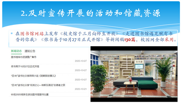 2023年以来,图书馆围绕八个方面开展工作:修订规章制度;以数据驱动支撑图书馆服务师生的体系;发挥校史馆文化传承和育人功能;优化场馆设施设备和服务,师生更愿意进馆学习;提高图书采购质量,提升师生借阅量;做好数字资源保障及使用培训;创新活动方式,吸引学生走进图书馆;组织师生参加图书馆行业相关比赛。在特色及创新方面,2023年11月16日成立“四·时”读书社并运行至今,社团章程规范,累积拥有社员70余人,已分享了34本中外著作,在分享交流与互动中,主讲人和听众都在其中收获了成长。及时宣传馆藏资源和开展的系列活动,在图书馆网站发布新闻130篇,在微信公众号发布推文390条,让师生从中了解自身所需资源如何获取和使用。