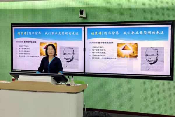 针对刚开馆不久的侬书斋从场馆布局、座位预约及时长、智能方式等进行了详细介绍。并解释了侬书斋的深刻含义:“侬在文言文中的含义是‘我’;在现代上海方言的含义是‘你’;与上海农林的“农”是谐音,又与图书馆书香氛围‘浓’是谐音;‘书斋’就是书房的意思。侬书斋寓意为这是你我的书房,是上海农林书房,欢迎师生走进侬书斋静心学习思考悟道——博学悟道 源远流长。”最后,樊老师用印度图书馆学家阮冈纳赞-图书馆学五定律结束对图书馆的介绍:“书是为了用的,每个读者有其书,每本书有其读者,节省读者的时间,图书馆是一个生长着的有机体。”