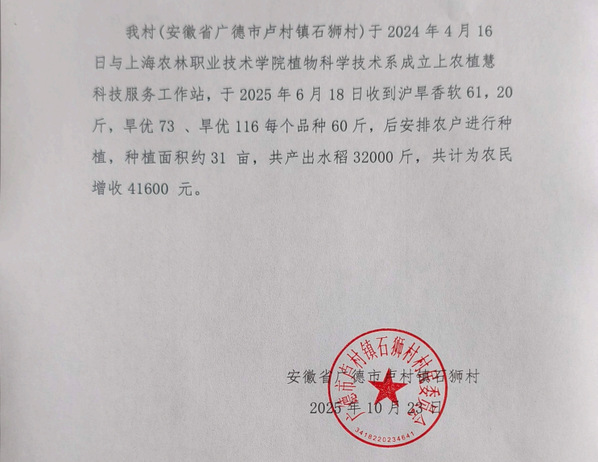 近日,植物科学技术系与安徽省广德市卢村乡石狮村在节水抗旱稻种植推广方面取得新进展。自2024年项目启动以来,双方持续深化合作,不断积累技术经验。2025年,在上农植慧科技服务工作站的协助下,节水抗旱稻在新垦还耕地块上再获丰收,经济效益与示范效应较去年实现双提升。