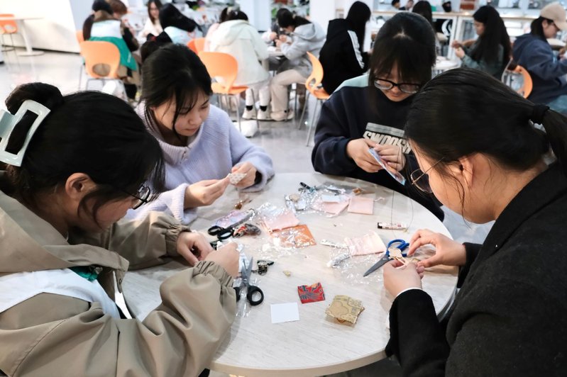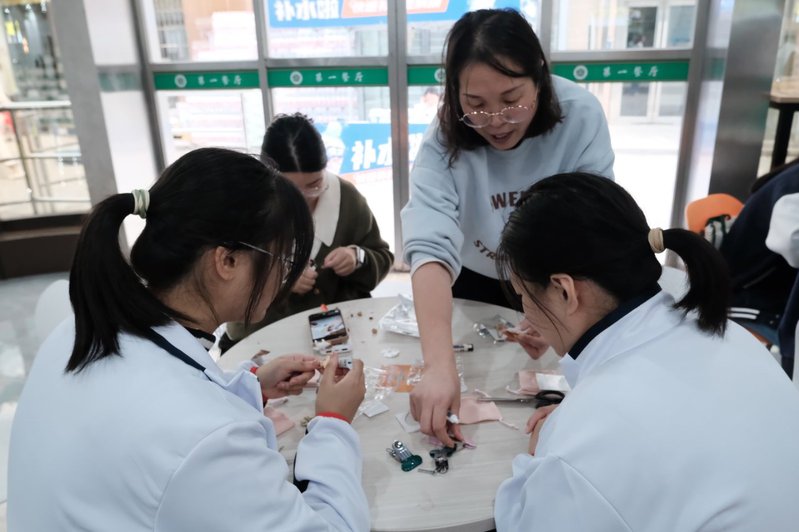 本次活动以中药手链制作与宋锦发夹DIY为核心体验项目,为同学们搭建了近距离感受非遗魅力的平台。活动现场,指导老师手把手指导同学们穿绳打结、裁剪组装,从山楂籽、菩提根等天然中药材的搭配,到“中国四大名锦”之一宋锦面料的纹样解读,每一个细节都融入了传统文化的深厚底蕴。同学们全神贯注投入创作,或相互交流技巧,或向老师请教难题,原本看似复杂的手作工序,在老师的耐心指导下变得简单易懂,活动不仅让同学们切实感受了中药文化的古朴韵味与宋锦工艺的美学价值,更在潜移默化中提升了审美素养与动手能力。