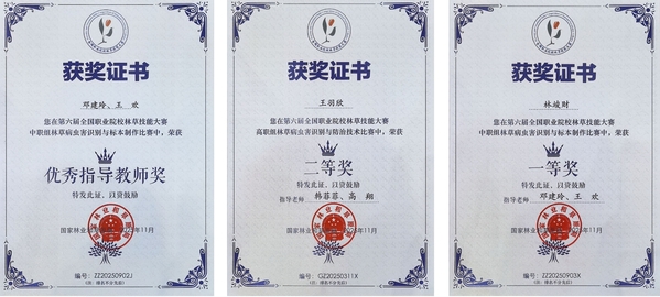 11月4日,第六届全国职业院校林草技能大赛“林草病虫害识别与防治技术”(高职组)及“林草病虫害识别与标本制作”(中职组)赛项落幕。来自全国高职院校的48支参赛队伍与中职院校的17支队伍齐聚一堂,同台竞技,展现了新时代职业院校学生的精湛技能与专业风采。经过激烈比拼,我院植物科学技术系学生林俊财斩获中职组一等奖,王羽欣荣获高职组二等奖;邓建玲、王欢荣获“优秀指导教师”称号。