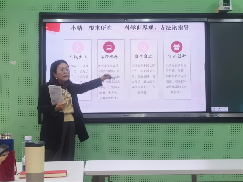 在教学创新融合分享环节,马院教师围绕《大学生思想热点面对面》如何有效融入“习近平新时代中国特色社会主义思想概论”课程展开深入研讨。刘悦老师系统阐述了“中国特色社会主义”主题的整体融入路径,从理论逻辑与实践案例双维度设计教学模块;王欢欢老师以“坚持中国共产党的领导”为核心,分享了“历史逻辑——理论逻辑——实践逻辑”三线融合的教学思路;廖元春老师结合“全过程人民民主”备课实践,从议题选择、案例筛选到教学反思进行了全流程复盘。