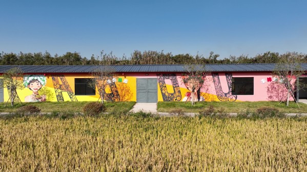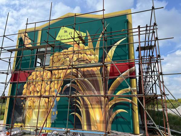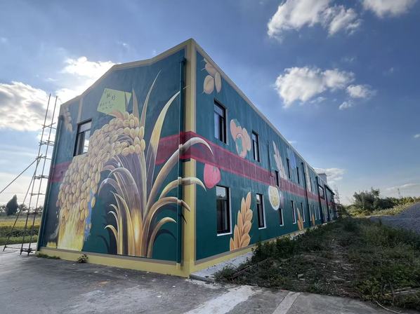 学院前期已经和石湖荡镇建立合作关系,创意系师生多次进入石湖荡镇小独圩岛开展调研,并开展农民培训项目,在打造浦江之首大米再生馆规划设计方案的前提下,学院深入挖掘创意系专业特色,为石湖荡镇小独圩岛提供更多乡村服务。本项目由数字经济与创意系风景园林设计专业负责人张婷老师担任技术负责人,系统梳理和提炼石湖荡镇的特色文化元素,如“浦江之首”地标、水稻文化等,并将其转化为富有创意与美感的墙体彩绘,打造可体验、可传播的乡村文化景观,为乡村振兴注入可持续的内生动力。项目从设计到落地历时三个月,风景园林设计专业工作室联合创意系视觉传达等专业师生,共同参与方案设计与施工,充分展现了跨专业协作与产教融合的成果。