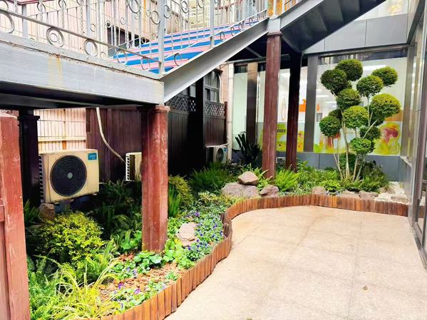 位于第三餐厅楼梯转角处的“边角之地”,经过精心改造焕发新生。整体设计巧妙运用鸢尾、天堂鸟、多头亮叶女贞等耐阴植物的层次组合,呼应楼梯结构的起伏变化,将原本被忽略的角落转化为一处可驻足、可观察、可交流的微生态空间。细腻的景观布置不仅以植物的柔和生机消解了建筑的硬朗感,更让原本昏暗的阴影区域转变为“可触摸的自然课堂”。让“无用的角落”生长出“有用的自然温度”,体现了环境育于细微之处的服务理念。