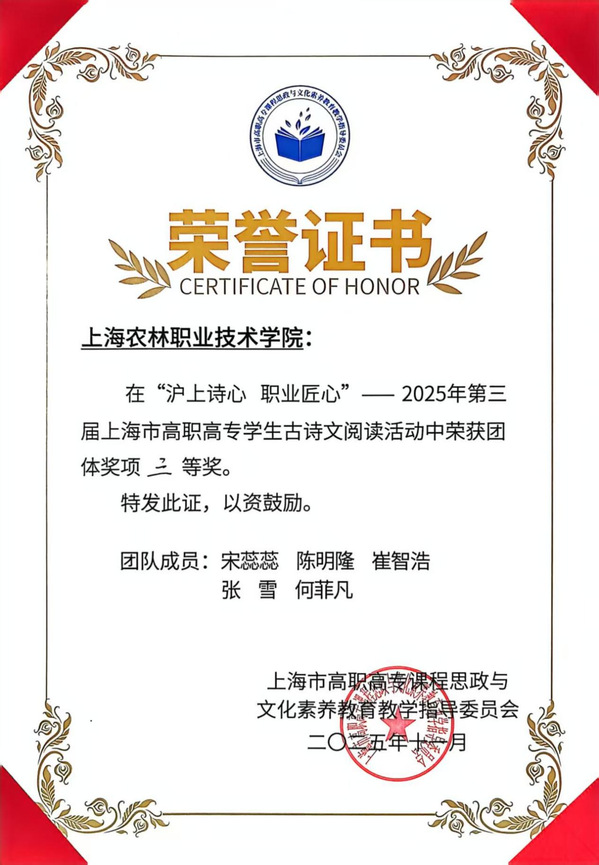 11月28日,“沪上诗心,职业匠心”——2025年第三届上海市高职高专学生古诗文阅读活动落幕。在竞争激烈的决赛中,由我院5名学生组成的代表队稳定发挥,荣获团体三等奖。学院因组织工作表现突出,获评“优秀组织奖”,指导教师团队荣获“优秀指导教师奖”。这是我院首次在该项赛事中闯入决赛并实现奖项突破。