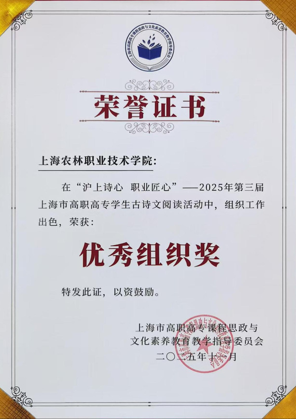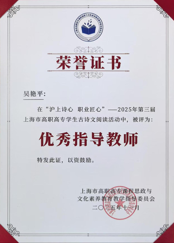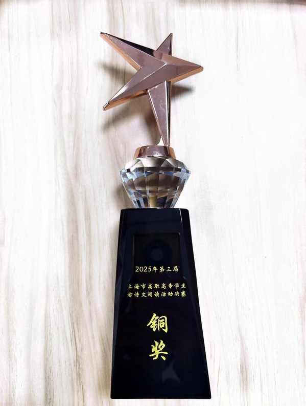 11月28日,“沪上诗心,职业匠心”——2025年第三届上海市高职高专学生古诗文阅读活动落幕。在竞争激烈的决赛中,由我院5名学生组成的代表队稳定发挥,荣获团体三等奖。学院因组织工作表现突出,获评“优秀组织奖”,指导教师团队荣获“优秀指导教师奖”。这是我院首次在该项赛事中闯入决赛并实现奖项突破。