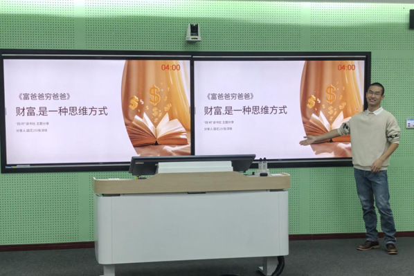 11月28日下午,在综合楼402智慧教室,“四·时”读书社开展本学期第九次读书分享会。由读书社社员、园艺251张淳轶分享美国企业家罗伯特·清崎的理财启蒙经典《富爸爸穷爸爸》。指导老师樊清誉和社员们共同探讨了不同的财富观念与人生选择,学习如何构建理性的理财思维。