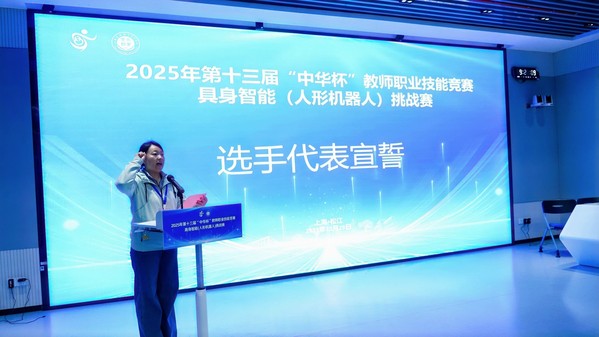 选手代表虞亚楠登台宣誓,承诺将严格遵守竞赛规则,秉持公平竞争理念,全力以赴展现职业教育教师的专业风采。裁判代表张帆郑重宣誓,将以专业、公正的态度履行评审职责,切实保障赛事的公平公正。上海中华职教社办公室三级调研员何朝霞宣布比赛正式开始,第十三届“中华杯”具身智能(人形机器人)挑战赛在万众期待中拉开帷幕。