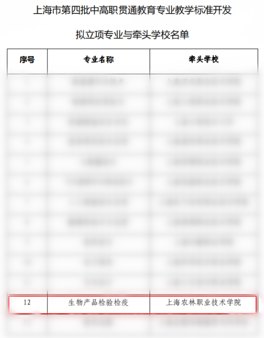 近日,从上海市教育委员会职业教育处获悉,学院申报的生物产品检验检疫中高职贯通教育专业教学标准开发项目立项。