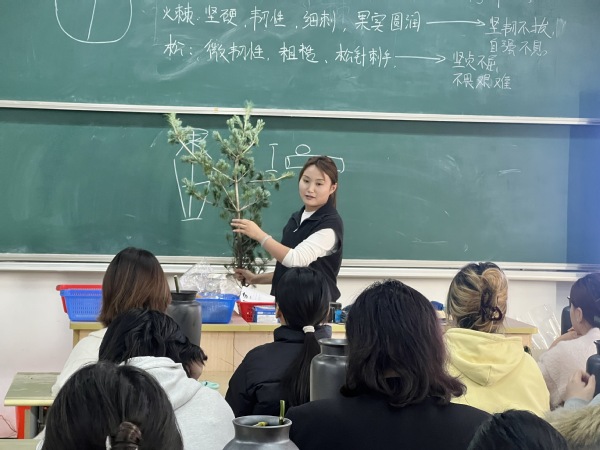 植物科学技术系杨灵芝老师带来《季节插花》课程,通过讲解松、火棘、竹子的搭配形式与修剪技巧,引导学生理解如何运用倾斜式、直立式等构图手法塑造插花作品的美感与意境。课堂结合松竹搭配凸显层次、松与火棘组合点亮色彩等实操案例,使学生深入体会“岁寒三友”(松竹梅)所承载的坚毅、正直与高洁的人文内涵。