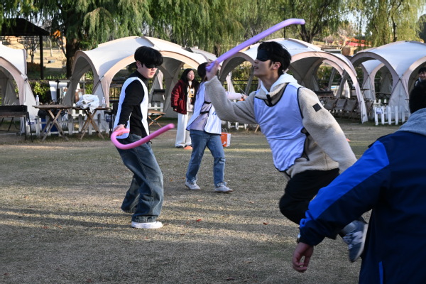 各团队依次参与了“沙包投壶”“蒙眼互打”“桃花多多开”等经典项目。在“沙包投壶”挑战中,队员瞄准靶盘时,队友凑上前支招“往左挪半脚”,中高分区就集体欢呼,没投中时立刻有人拍肩打气“下轮稳了”,满是互助暖意;在“蒙眼互打”游戏中,参赛队员提前蒙好眼罩,手持充气棒在划定区域内待命,队员蒙眼挥棒时,场外队友急着喊“左边!往左边躲!”,出局者笑着冲队友比“加油”手势,对抗里满是热闹互动,在轻松对抗中拉近了彼此距离;在“桃花多多开”项目里,大家先在草坪上自由散开,随着教练“桃花桃花开几朵”的指令声响起,大家边跑边喊队友名字组队,缺人时立刻有人补位,组队成功就击掌庆祝,全程笑声不断,更让整个活动现场充满了活力与温情,深刻体会到“集体归属感”的重要性。