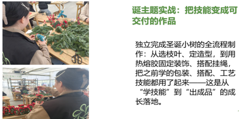 “云间卉谷班”依托云间卉谷企业的花卉物流与营销资源,对6名学生开展花艺设计、花卉工艺品创作、花艺沙龙社会培训、花卉打包及营销等实训,深化对花卉采后处理与市场拓展的理解。