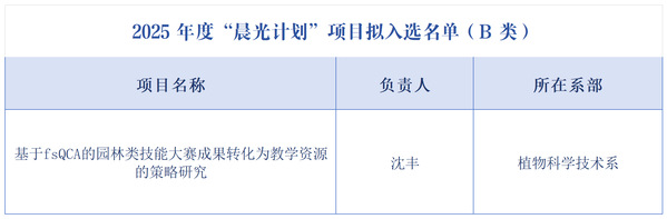 2025年度“晨光计划”入选名单近日公布,植科系沈丰老师成功入选。此次申报的项目《基于fsQCA的园林类技能大赛成果转化为教学资源的策略研究》将以园林类技能大赛为对象,运用fsQCA方法揭示赛事成果转化为教学资源的多元路径,拟构建“理论框架—实践路径—保障机制”体系,有助破解成果筛选盲目、转化单一、校企协同不足等难题,助推“赛教融合”,提升人才培养质量。