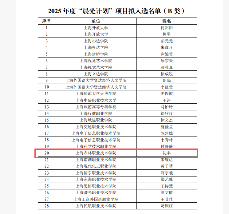 近日,上海市教育委员会、上海市教育发展基金会公布了2025年度“晨光计划”入选名单,植物科学技术系沈丰老师成功入选,此次申报的项目《基于fsQCA的园林类技能大赛成果转化为教学资源的策略研究》将以园林类技能大赛为对象,运用fsQCA方法揭示赛事成果转化为教学资源的多元路径,拟构建“理论框架—实践路径—保障机制”体系,有助破解成果筛选盲目、转化单一、校企协同不足等难题,助推“赛教融合”,提升人才培养质量。