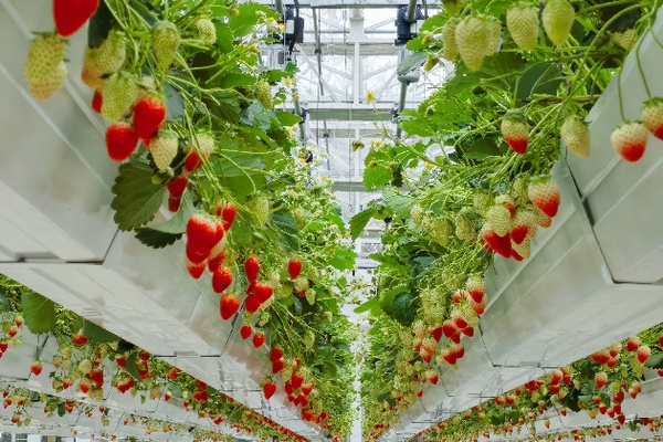 据悉,温室草莓悬挂栽培智能化种植生产技术是我院独立研发的技术成果。该技术涵盖环境调控、水肥管理到智能设备操作、数据追溯等全流程技术要求。种植系统采用电动可升降吊挂式立体栽培方式,可将种植槽悬挂在空中通过控制不同种植槽高度,形成可升降式和固定吊挂式高架基质栽培草莓,造出“草莓天瀑”景观。