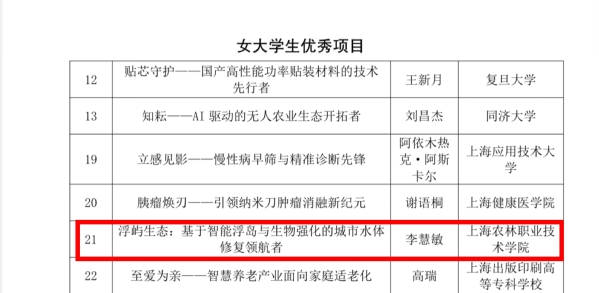 “巾帼新力量 慧创赢未来”2025年上海市女大学生创新创业大赛获奖结果近期公布,我院“浮屿生态:基于智能浮岛与生物强化的城市水体修复领航者”荣获女大学生优秀项目,学院荣获优秀组织奖(集体),张楠老师荣获优秀组织奖(个人)。