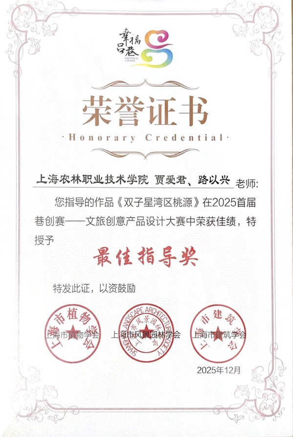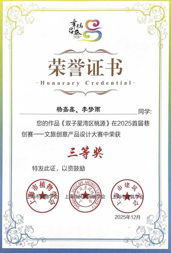 近日,2025首届“巷创赛”颁奖仪式在上海市金山区吕巷镇落幕。创意系视觉传达设计专业学生杨嘉鑫、李梦雨在专业教师指导下,依托扎根乡土的创意设计作品,在文旅创意产品设计赛道中荣获三等奖;宋子昕、祝心怡、李梓毓分别获得优秀特色奖和成长荣誉奖;路以兴、贾爱君荣获“优秀指导”奖。此次获奖不仅展现了视觉传达专业学生扎实的专业功底,也体现了“以赛促教 以赛促学”育人模式的成效,彰显出青年设计力量服务乡村振兴的使命担当。