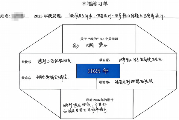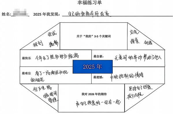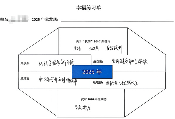 为引导大一新生梳理2025年成长得失、沉淀过往感悟,同时把握学生转型适应期的真实想法,倾听学生心声、凝聚班级向心力,近期,智工系面向软件高本251班、物联网251班、物联网252班全体新生,组织开展“记录成长足迹 定格青春幸福”主题活动。活动以“幸福练习单”为载体,串联“回顾2025,展望2026”的核心诉求,为系部推进学生工作、助力学生全面发展筑牢基础。
