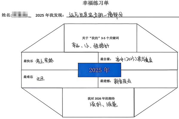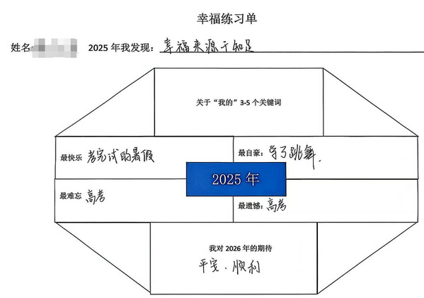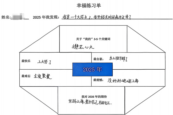 本次活动围绕“2025年我发现”“最快乐”“最自豪”“最难忘”“最遗憾”“2026年期待”六大维度设计,既契合跨年之际“复盘过往、奔赴新程”的情感基调,也贴合学期末“总结学业、规划未来”的现实需求,为学生搭建起敞开心扉、真实表达的平台。征集过程中,新生们踊跃参与,用质朴而真诚的文字定格独属于自己的青春印记:有人细数高考落幕的轻松喜悦,记录与家人挚友同行旅途的温暖点滴;有人自豪于独自求学路上的独立蜕变,分享兼职实践中的坚持与收获,也不忘复盘学期内学业上的进步与不足;更有人坦然直面高考失利的遗憾、初入校园的社交融入困惑,在学期末的节点上梳理心结、寻求突破;众多学生还写下对2026年的美好期许,“顺利通过英语四级”“扎实掌握专业技能”“结识更多志同道合的朋友”“期末取得理想成绩”等心愿质朴而坚定,既衔接过往,更谱写新篇。