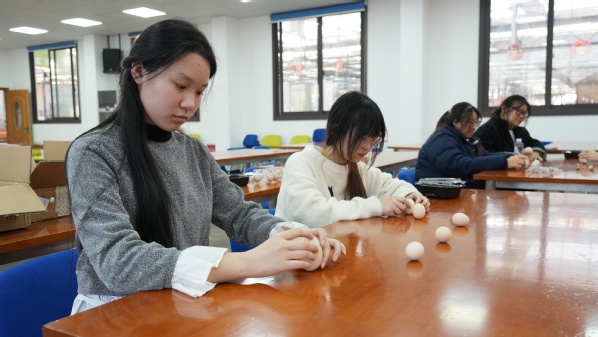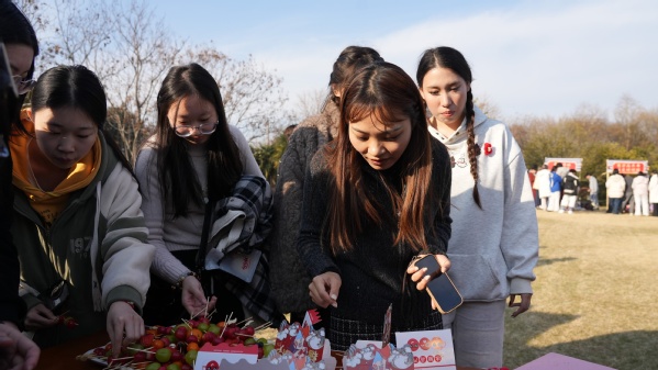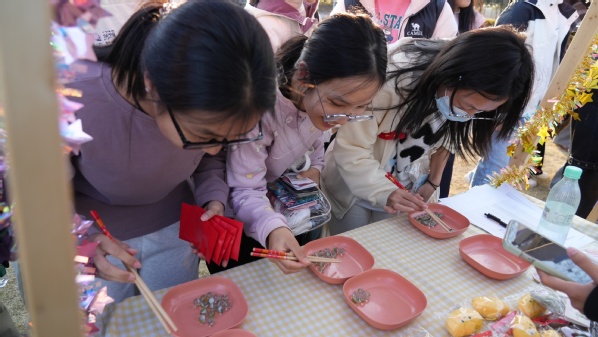 随着舞龙鼓乐的铿锵节奏,“新春乐游会”正式拉开帷幕。市集以“农味+非遗”为特色,精心设置糖画制作、手工棉花糖、拓印、写春联、投壶、糖葫芦DIY等20余个互动摊位,师生们自由穿梭、动手体验,在传统民俗中感受中华优秀传统文化的魅力,收获满溢新春气息的独特记忆。