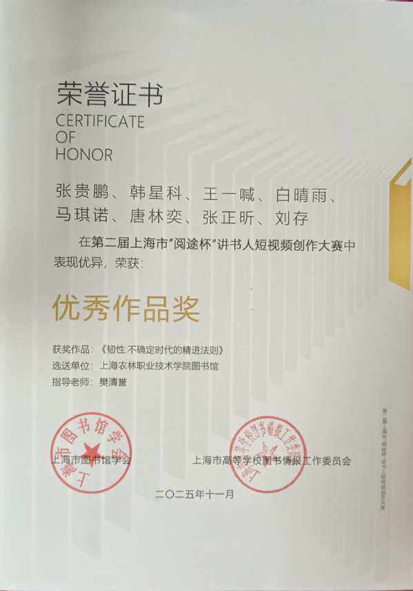 近期,图书馆收到第二届上海市“阅途杯”讲书人短视频创作大赛获奖证书。短视频《韧性:不确定时代的精进法则》在第二届上海市“阅途杯”讲书人短视频创作大赛中表现优异,荣获优秀作品奖。作品由“四·时”读书社张贵鹏、韩星科等八位社员合作完成,指导老师樊清誉。
