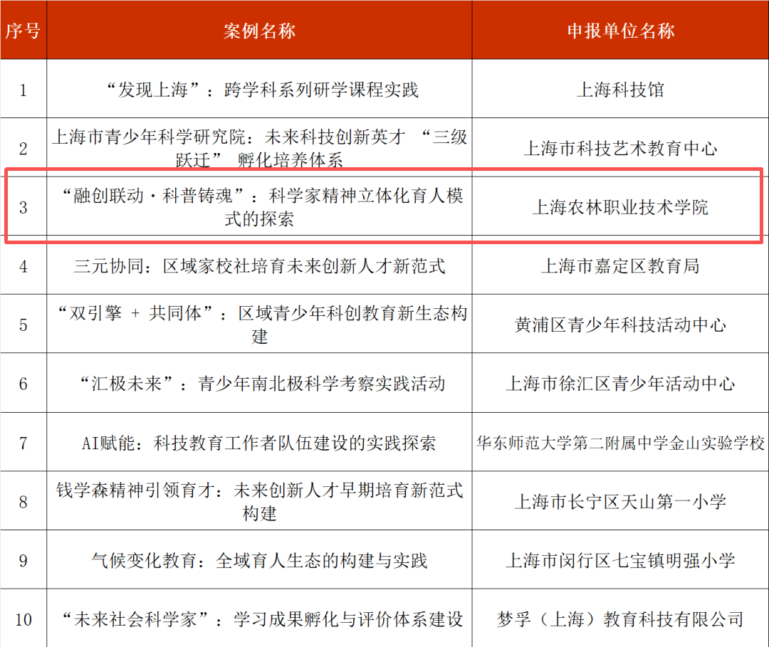 近日,由上海市科创教育指导委员会、上海市教育学会、上海市民办教育协会等五家单位联合举办的“2025上海科创教育优秀案例征集活动”评选结果正式公示。我校申报的《“融创联动·科普铸魂”:科学家精神立体化育人模式的探索》案例,从全市众多申报项目中脱颖而出,成功入选,荣获“2025上海科创教育十佳优秀案例”称号。