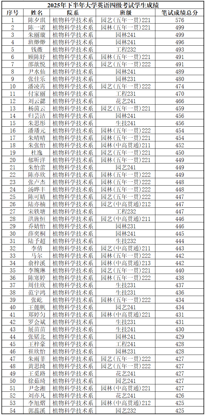 近日,2025年下半年全国大学英语四、六级考试成绩正式公布。植科系学子在此次考试中表现优异,英语四级通过人数达54人,创下系部历年来英语四级通过人数新高,较去年同期实现93%的大幅增长。园艺(五年一贯)221班的陈夕琪同学以576分的优异成绩位列全校第一。